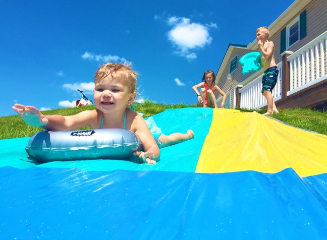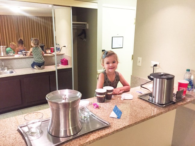 As we made our way inside I was focused on figuring out who would sleep where. We had been upgraded to a suite that had one giant king bed and a sofa that pulled out into a bed. As I was unloading the cart, I heard a little voice ask me if I wanted creamer in my coffee. I turned around to see Kinsley up on the counter of the bar, stirring up a concoction of water, sugar and who knows what else. Her smile was humongous as she took our drink orders and quickly served up our “coffees” to us.